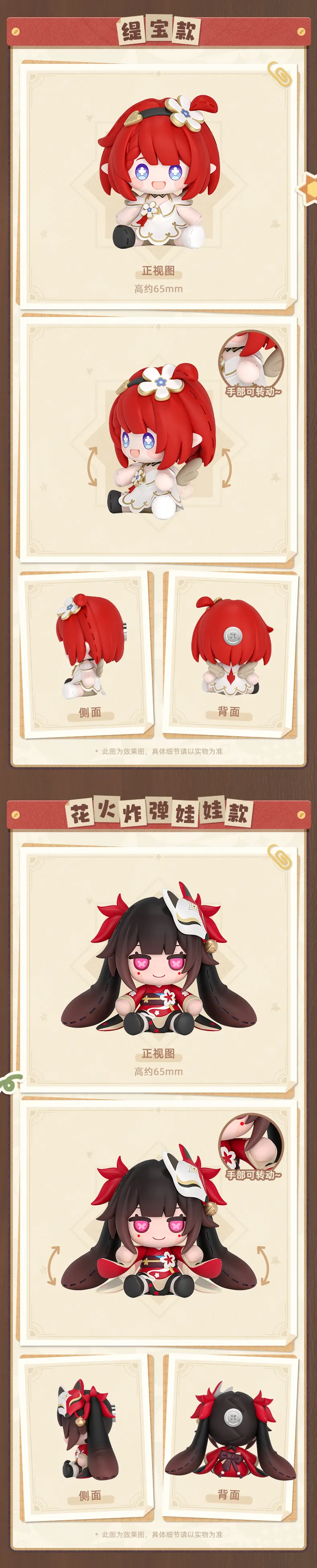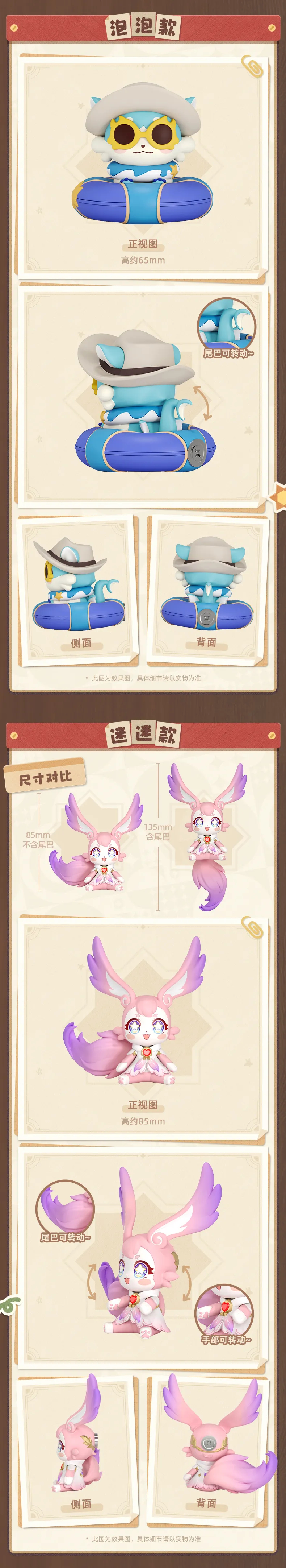 Размер: 65 мм (Искорка, Трибби), 80 мм (Пом-Пом), 85 мм (Мемо), 65 мм (Пузырик), 65 мм (Келус и Стелла), 65 мм (Искра)