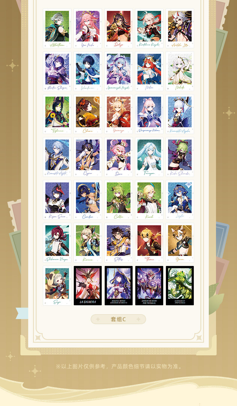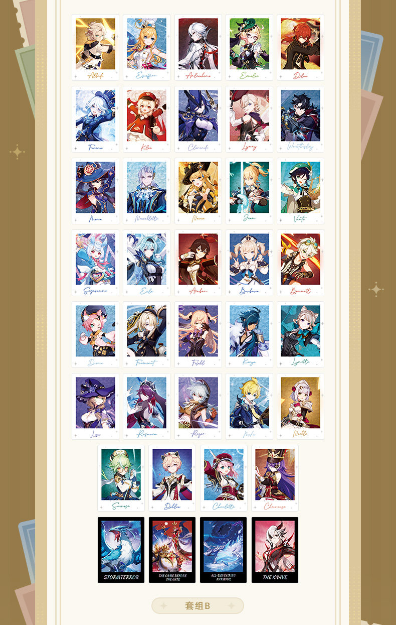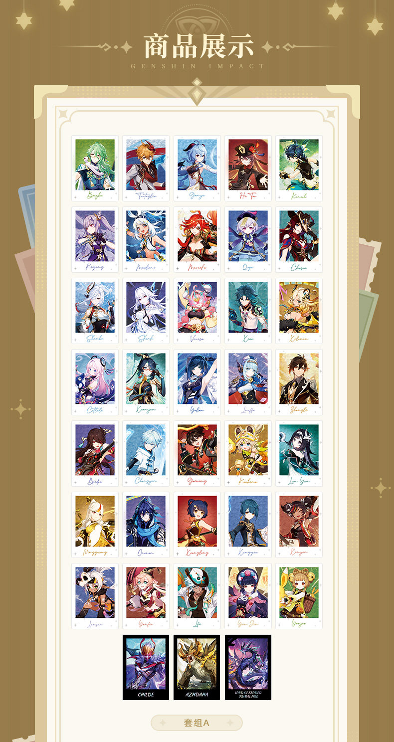 Персонажи: сет А - 38 карточек (регионы Ли Юэ и Натлан); сет B - 38 карточек (регионы Мондштадт и Фонтейн); сет С - 35 карточек (регионы Сумеру и Инадзума)